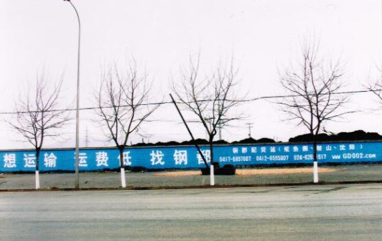 鞍山市钢都配货站在户外郊区设立:长50米*高2.5米墙体广告牌