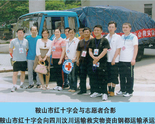 鞍山市钢都运输有限公司法人代表贾春全(左二)及夫人张滨娜(左三)和鞍山市红十字会会长(左四)、工作人员及汶川长途司机(左六)、志愿者人员合影 。